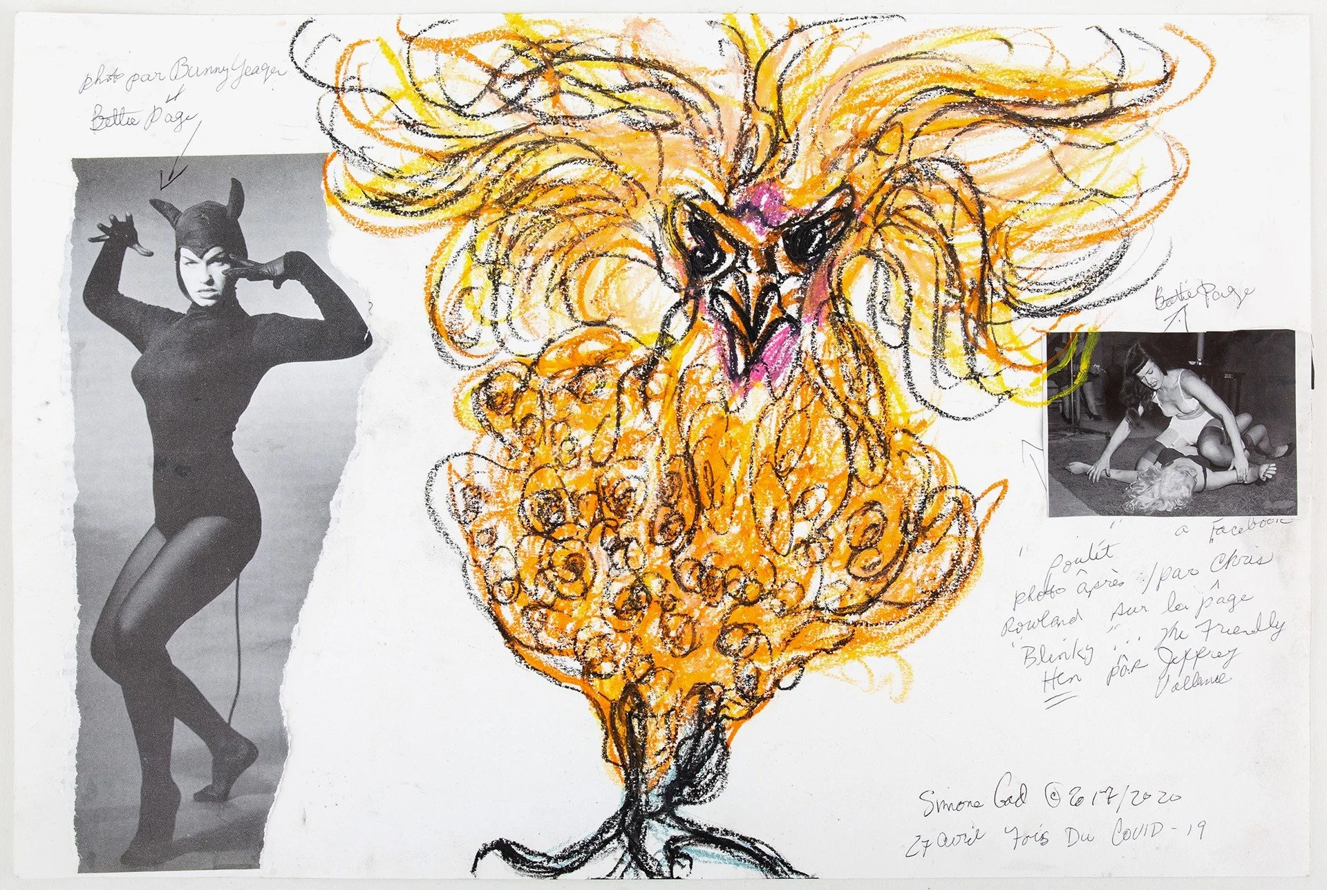 Simone Gad was born in Brussels in 1947. Her parents, who were Polish Holocaust survivors, moved the family to Boyle Heights neighborhood of Los Angeles in 1951. Gad’s mother immediately thrust her into the entertainment business at age four,where she took lessons, auditioned often, and was cast in some small roles. The abusive nature of Hollywood took its toll on Gad as she experienced the dark side of the acting business. So, in the early 1970s, she gave up acting and began making art. Initially mentored by Al Hanson and Wallace Berman, she created assemblage, drawings, paintings, and performance pieces. By the early 1980s, Gad was making personal “combines,” or assemblages, that were inspired by Southern California and her personal life. She was drawn to perform but still stayed away from film acting. At a talk at Track 16 in 2019 she remarked, “back then you were only allowed to have one career or you were considered a dilettante.” However, in the late 1980s, she returned to acting and appeared in many films and commercials in the following decades. Her father, who was a tailor, taught her how to draw animals using traditional techniques when she was a child, but when she began drawing rescue animals over the pinup drawings in the early 2000s, her technique and result was anything but traditional. Gad strategically used pinups with animal drawings to celebrate sexuality and resist prudish Victorian repression, creating several complex dichotomies. Gad also became part of Asher Hartman’s Gawdafful National Theater. She authored a trilogy of books titled Molested at the Movies that chronicled her life as an actress and artist. Gad exhibited continually in California for almost 50 years along with exhibitions in New York and Europe.